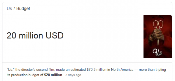 Ternyata, meski masuk box office dengan pendapatan menjanjikan, film ‘Us’ dibuat dengan budget yang terbilang kecil yang cuma memakan dana sebesar 20 juta dolar atau sekitar 285 juta rupiah. Dalam era perfilman sekarang, dana segitu udah tergolong kecil lho, Bro. Strateginya pinter, modalnya kecil untungnya gede.