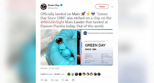 Berita ini datang langsung dari NASA, Bro. Robot InSight (Interior Exploration using Seismic Investigations, Geodesy and Heat Transport) yang biasa dipanggil Green Day oleh NASA ini akan menjelajahi planet merah itu untuk mempelajari interiornya, lho. Lucunya nih Bro, setelah berita robot Green Day ini mendarat di Mars, lewat account Twitter resminya Green Day menulis "Secara resmi mendarat di Mars. 'Green Day Since 1986' terukir pada sebuah chip di @NASAInSight Mars Lander yang mendarat di Elysium Planitia hari ini. Keluar dari dunia ini."