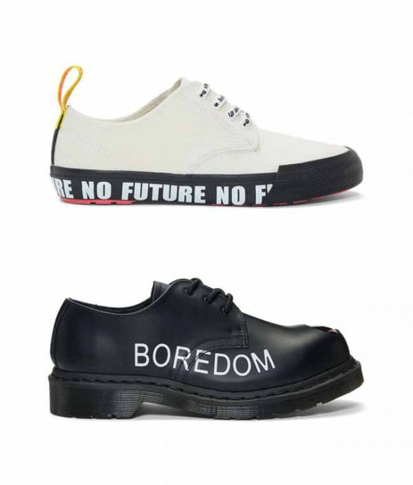 Tak hanya boots, ada juga sepatu kulit lain yang dibuat dengan model low-top. Gambar yang ditampilkan mulai dari member Sex Pistols hingga kutipan judul lagu seperti "I Wanna Be Me" atau "Boredom" dalam sepatunya.